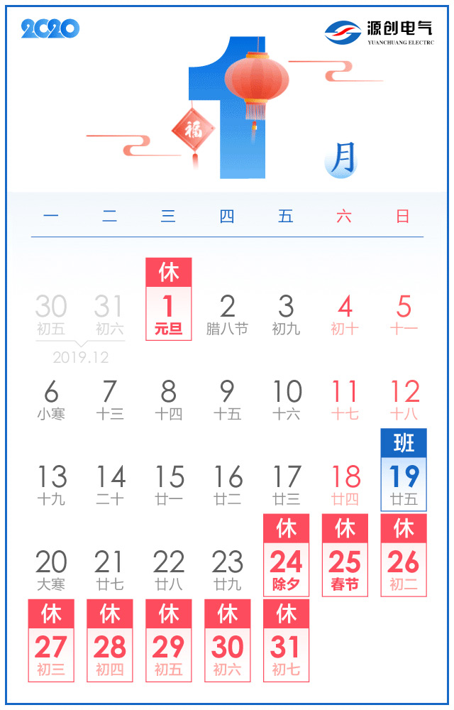 2020年1月1日放假,共1天。