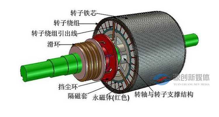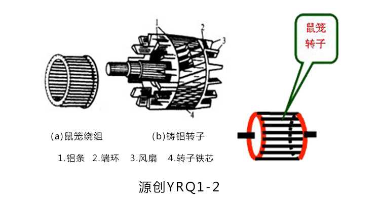 中小型鼠籠式異步電動機采用較便宜的鋁替代銅,將轉子導體,短路環和風扇等鑄成一體,成為鑄鋁鼠籠式轉子,如圖源創YRQ1-2用銅條安裝在轉子鐵芯槽內,兩端用端環焊接,形狀像鼠籠。